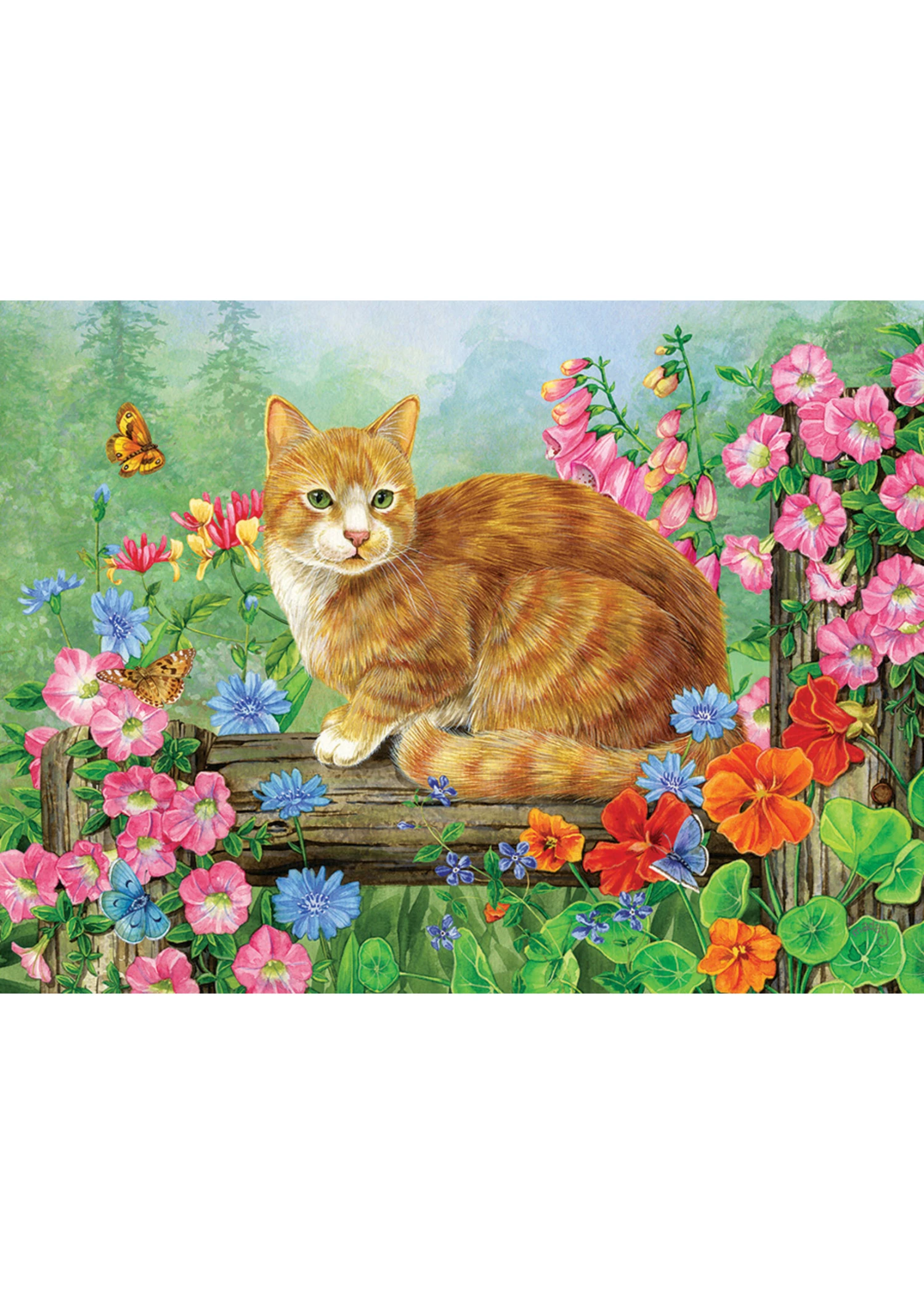 The little ginger cat has found her Perfect Perch on the wooden fence amongst the friendly butterflies and pretty flowers. A cheerful Easy Handling 275 piece puzzle with large pieces.