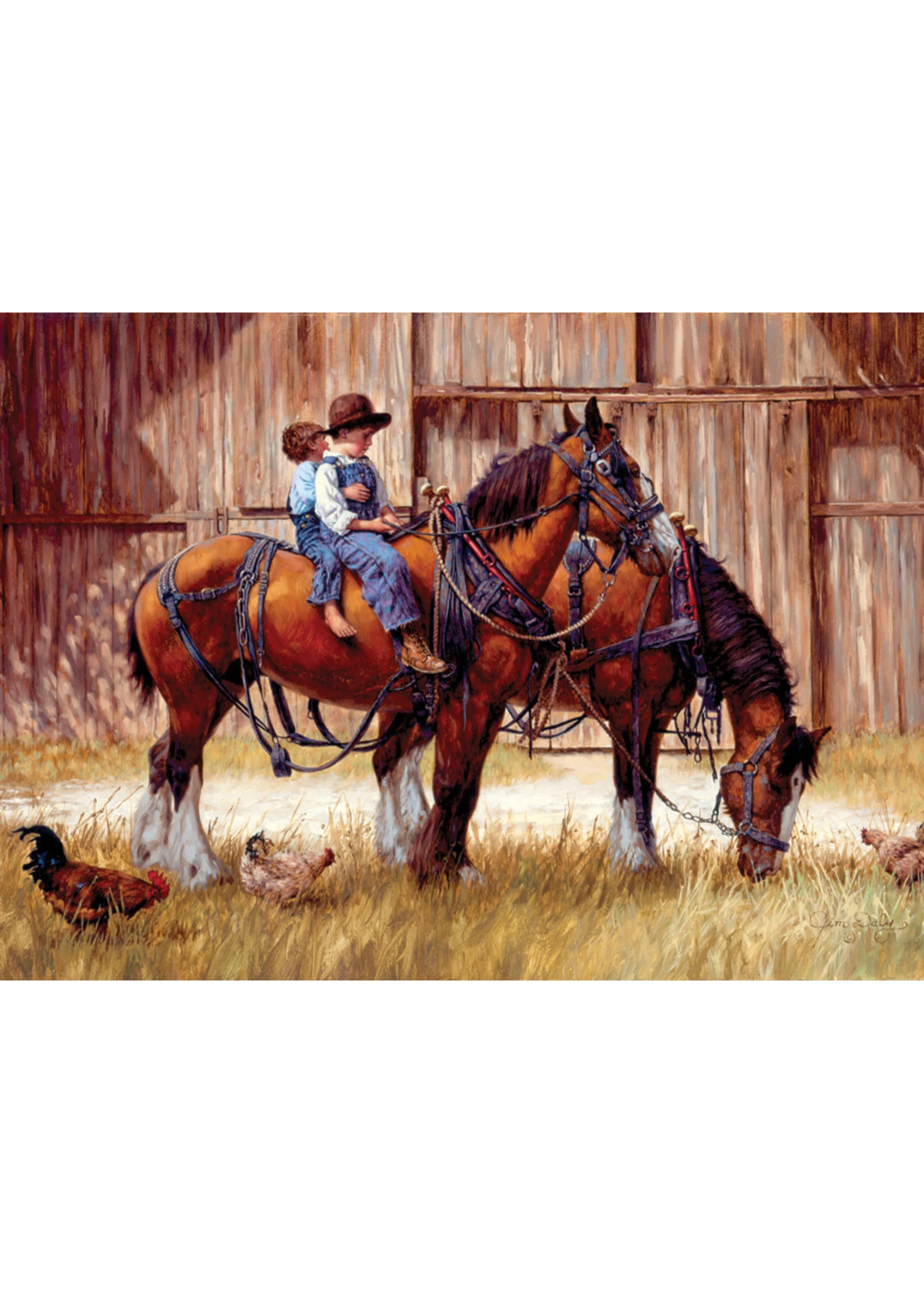 Artist, Jim Daly, captures the essence of Cobble Hill’s endearing puzzles in this beautiful 1000 piece jigsaw of big brother Steve giving young Dylan a horse ride ‘Back to the Barn’.