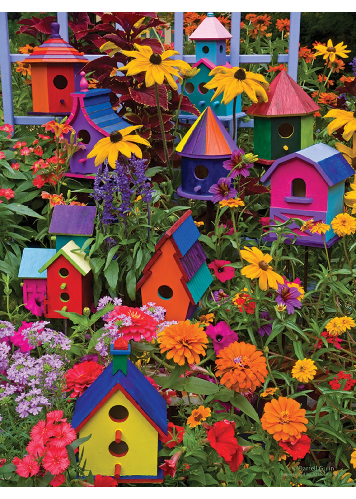 The beautiful Birdhouses are open for business! Accepting birds of all varieties to dine among our feeders and gather around our colorful garden of flowers. Every bird welcome, no reservations needed. Bring your cheer and chirp! Bright bold colors make this Easy Handling 275 piece puzzle a delight to work with and a great piece to frame when finished.