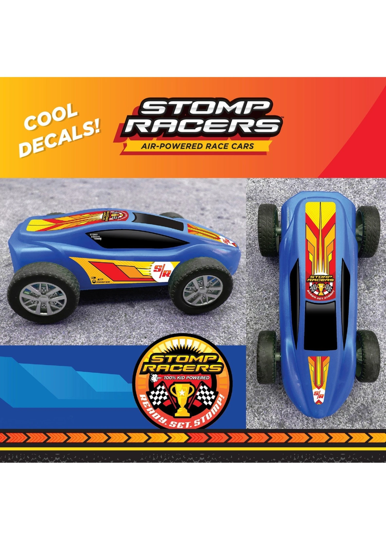 - Includes 2 Stomp Launchers to race your friends to the finish. Finish line, 2 cars and a ramp for executing jumps included. Decals to design your cars included. No batteries required; easy and fast assembly.