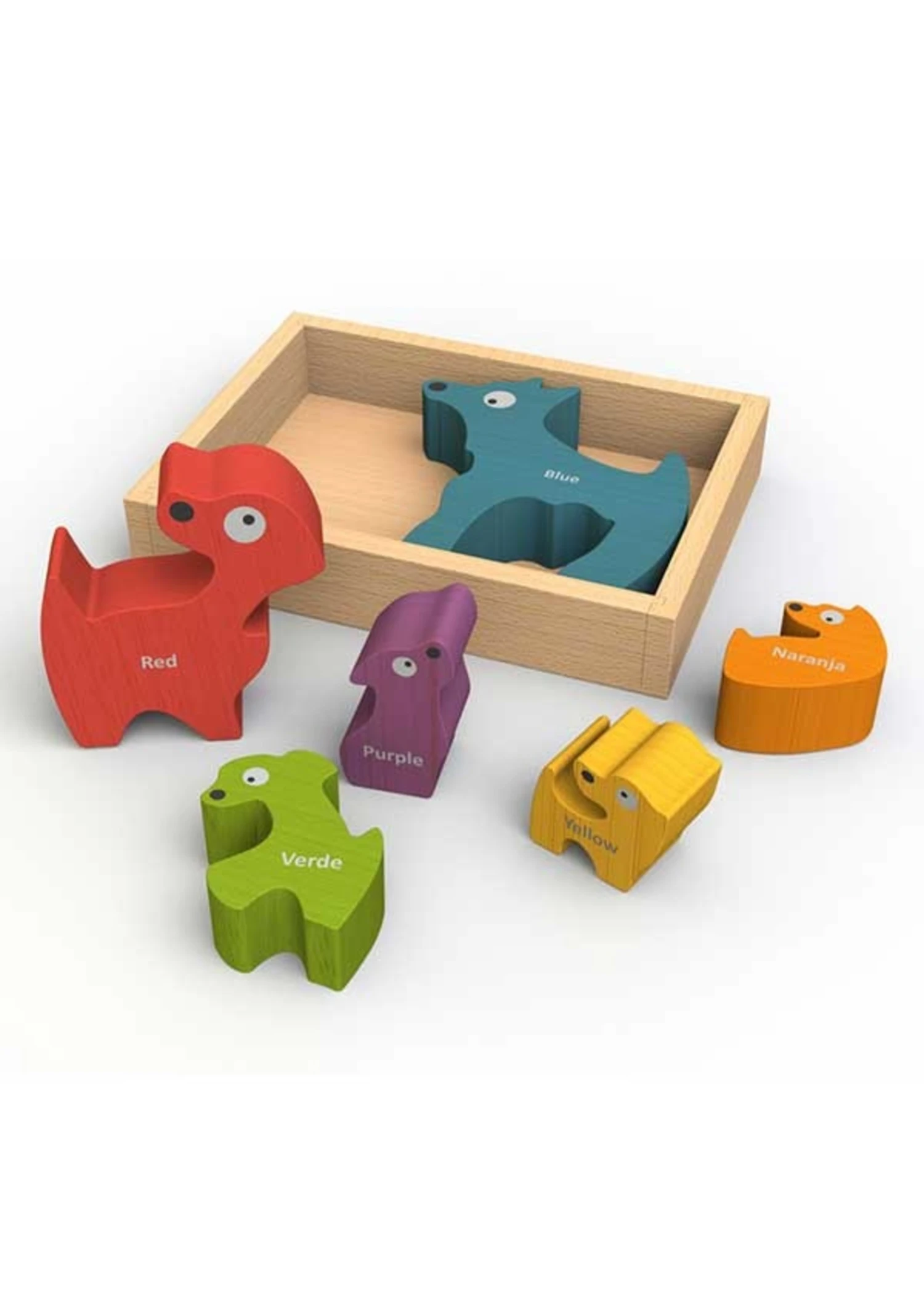 The Dog Family Puzzle is a wooden puzzle, learning toy, and character play set all in one! It’s a great first puzzle and helps develop fine motor and problem-solving skills. The dog characters are great for inspiring storytelling. Parents and teachers will love introducing colors in both English and Spanish. Clean up is easy with the wooden storage box that is included.