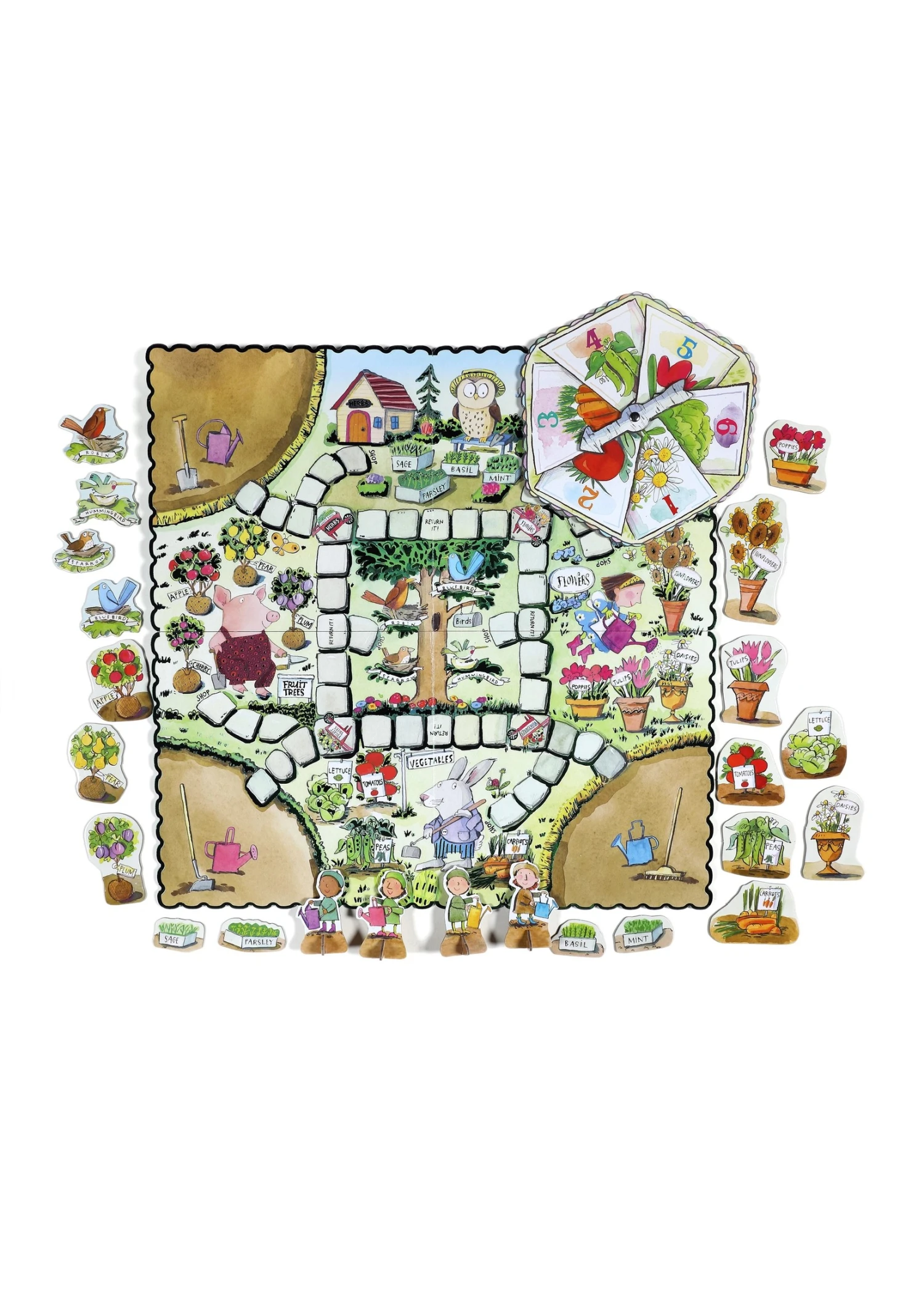 Gathering a Garden is a simple game that develops basic skills like patience, counting, and an understanding of different categories of plants and gardening-related elements. This is a perfect game for kids five years old and up. Bring this board game to family game night! Be the first to fill your garden! Move around the board collecting garden items from each shopkeeper and be the first to return to plant a garden. Game includes 18 x 18 inch sturdy game board, spinner, game pieces and plant tiles.