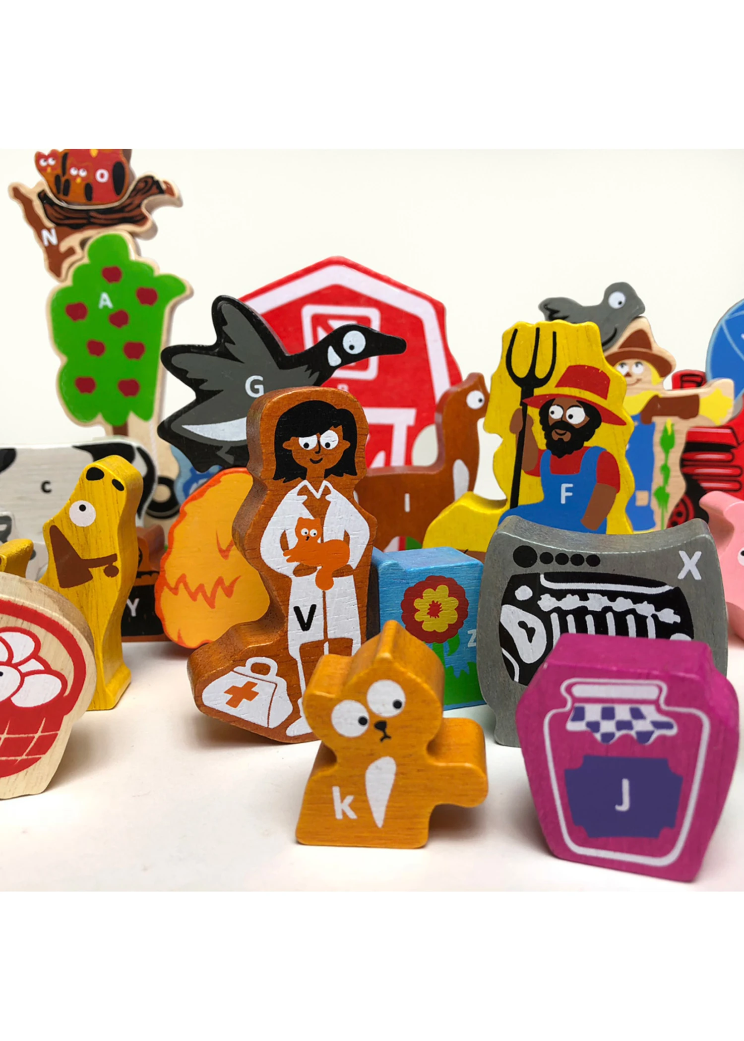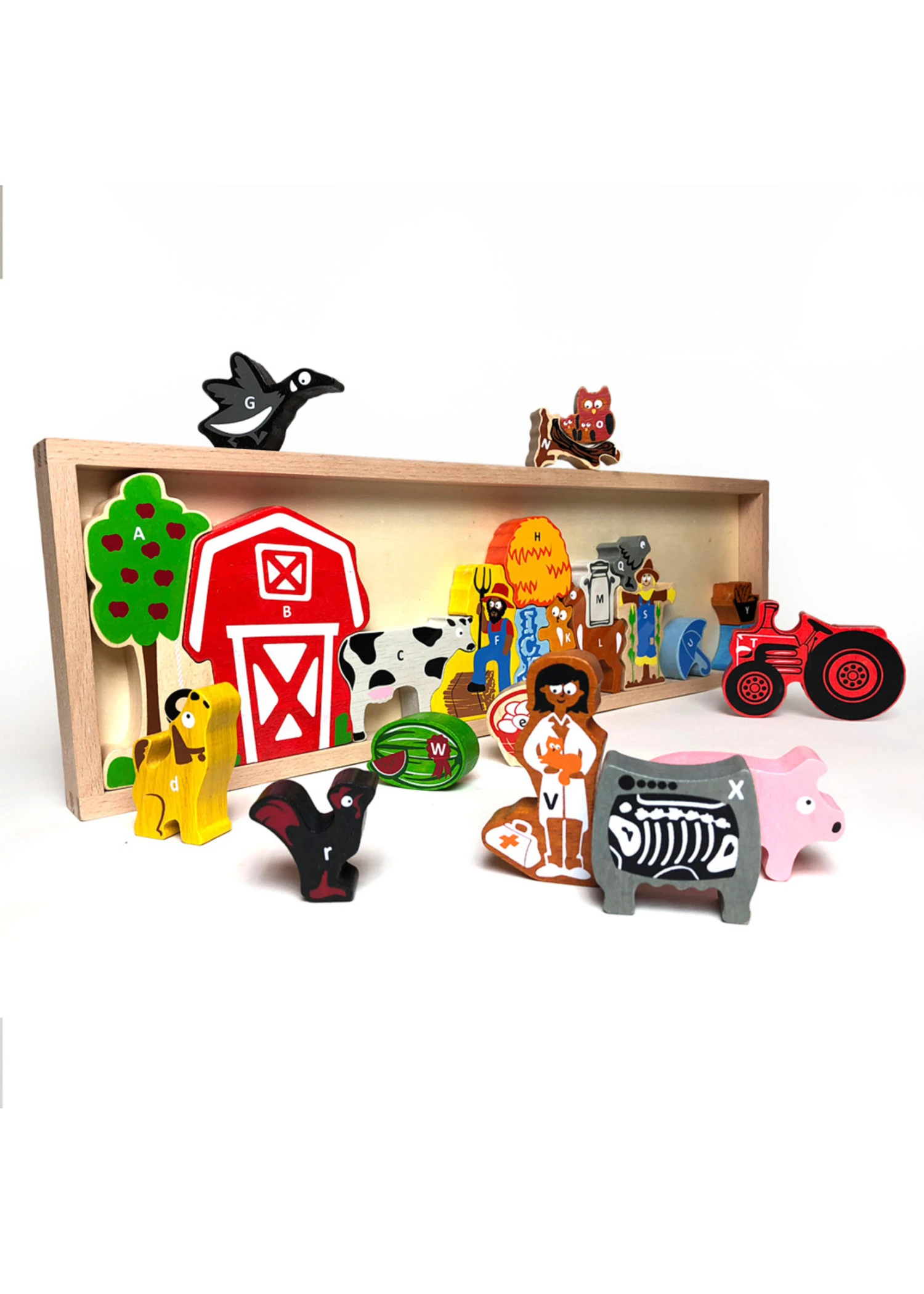 Each of the 26 chunky pieces is a familiar animal, plant, piece of equipment or person on the farm—from A for apple tree and C for cow, to T for tractor and V for veterinarian.