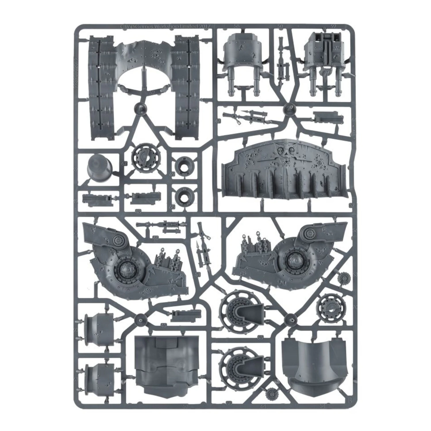 This multi-part plastic kit contains the components necessary to assemble a Plagueburst Crawler. An extremely front-heavy tracked dozer brimming with horrible weaponry, it is covered in thick armour pitted and rusting with corrosion and decay. A standout feature is the huge, spiked dozer blade, with a symbol of Nurgle proudly displayed, picked out in skulls. It bears 2 plaguespitters on the sponsons, which you can replace with the 2 included entropy cannon, and the heavy slugger at the front-centre can be replaced with a rothail volley gun – each option is equally potent, but the biggest worry to the enemy is undoubtedly the plagueburst mortar, whose targeting mechanisms and enormous barrel dominate the rear of the vehicle.