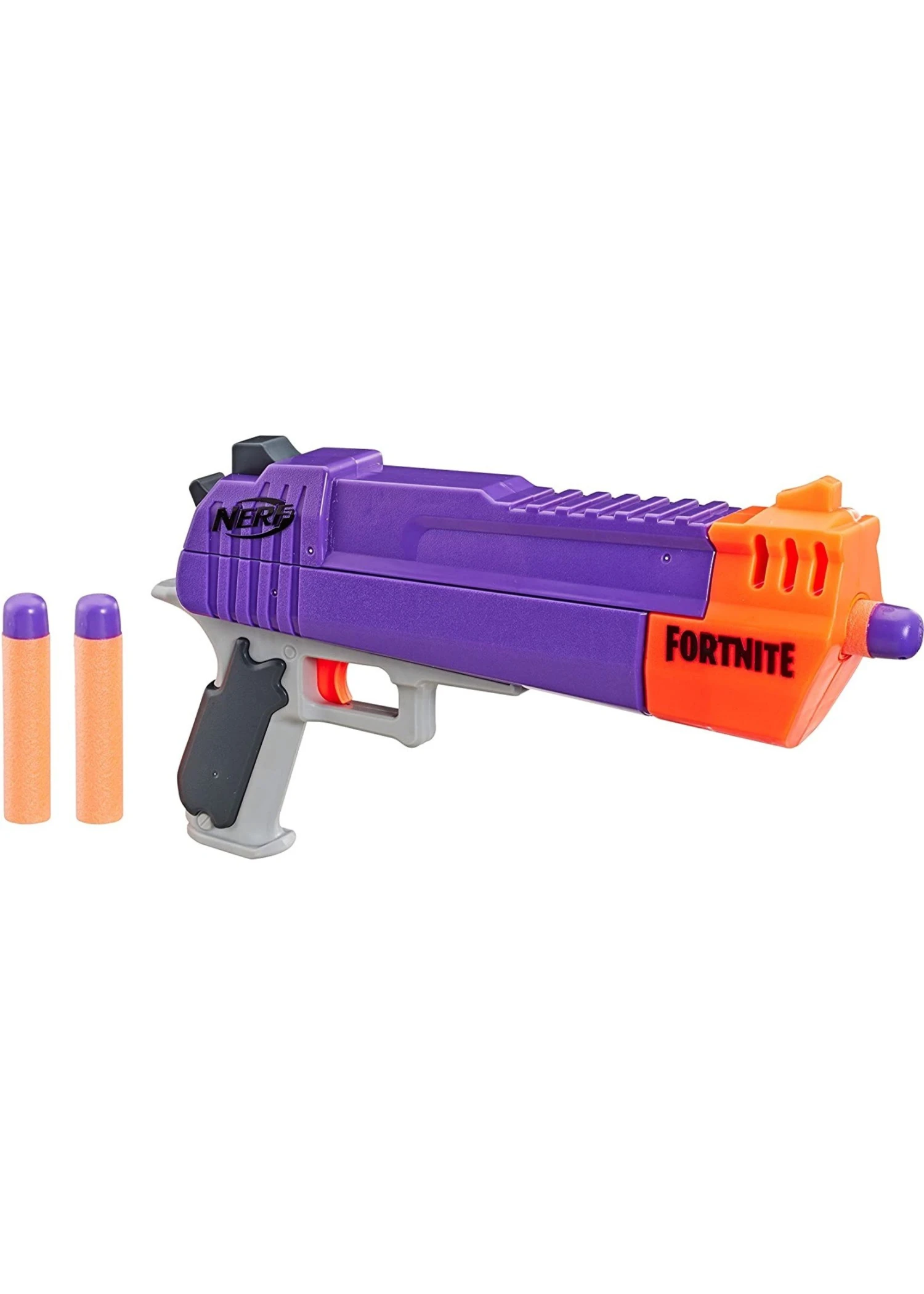 The Nerf Fortnite HC-E blaster is inspired by the blaster used in the Fortnite video game! Take your Fortnite battles into real life with this single-shot Nerf Mega blaster and storm into powerful dart blasting! Front-load 1 dart into the barrel, move the slide to prime, and pull the trigger to fire. It comes with 3 Official Nerf Mega darts. Official Nerf Darts are tested and approved for performance and quality and constructed of foam with flexible, hollow tips. Drop into indoor and outdoor Fortnite action with this dart-firing Nerf Mega Fortnite blaster! No batteries required.