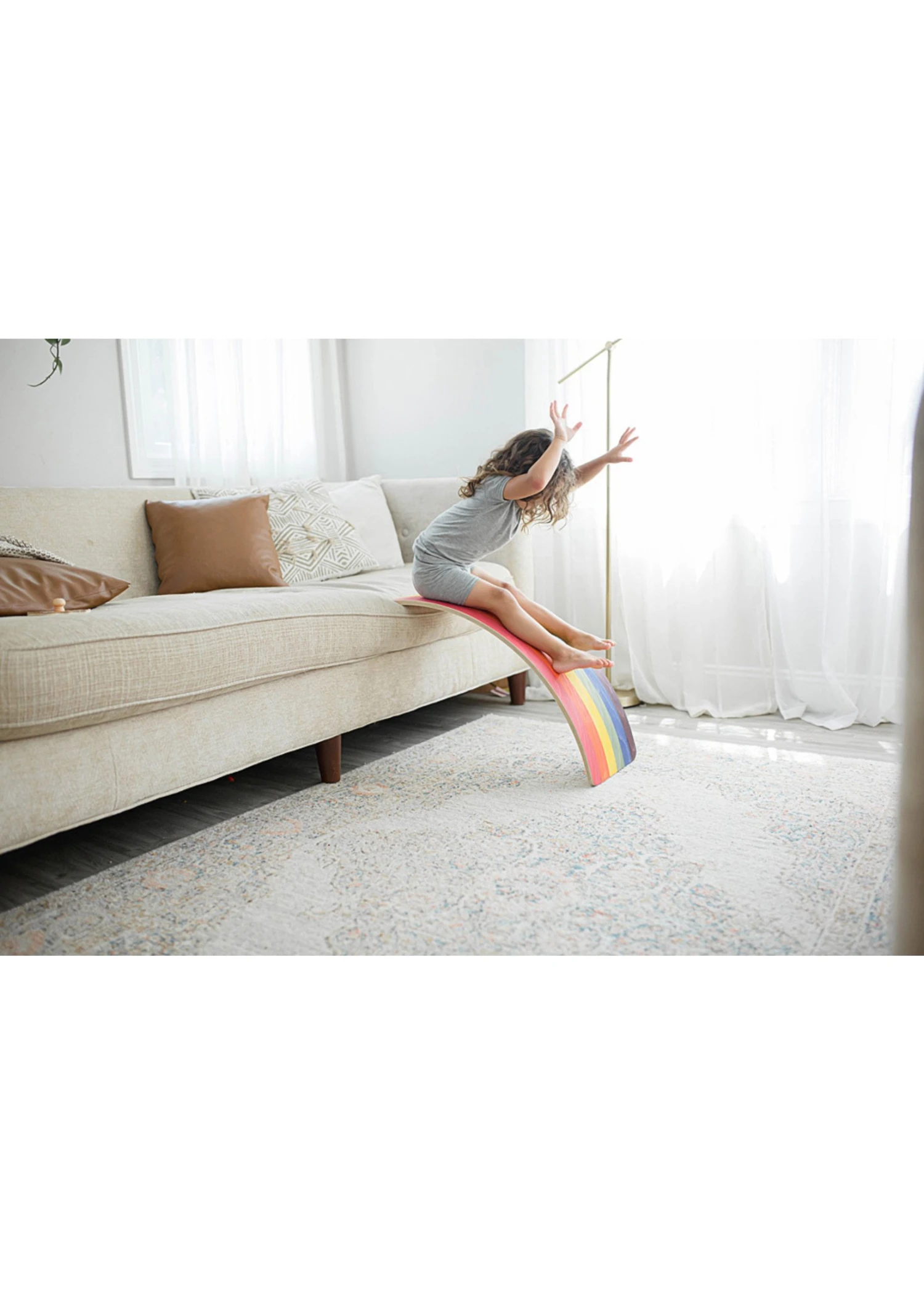 It’s a slide, bench, rocker, balance board, car ramp, river boat, tunnel, and just the coolest slice of natural birch ever. Beautifully crafted, in cheerful rainbow hues, this lovely board will inspire creative play while developing strength and motor skills, making it a perfect gift. Open-ended free play lives on! Made in the USA!