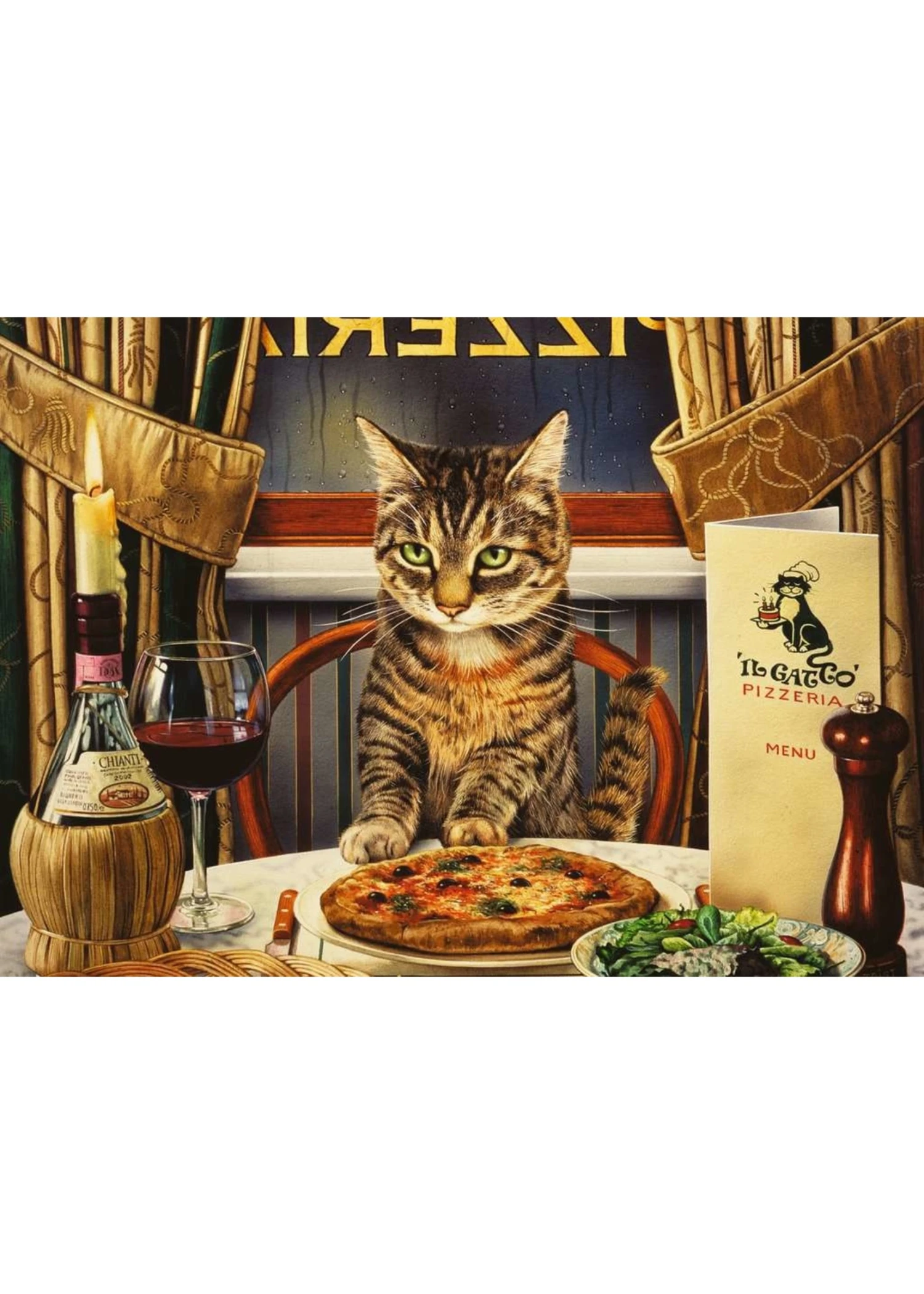 It’s a delicious pizza for one, with a thick, crunchy crust and, of course, double anchovies! Talbert the tabby is right at home at ‘N Gatto Pizzeria (after all, that’s Italian for “A Cat”). He’s even being healthy and having a side salad! From the irreverent imagination of British artist Geoff Tristram, this illustration makes a thoughtful gift for any cat-lover. With pieces 30% larger than standard, details are easy to see, so you can complete the puzzle in just an evening or two!