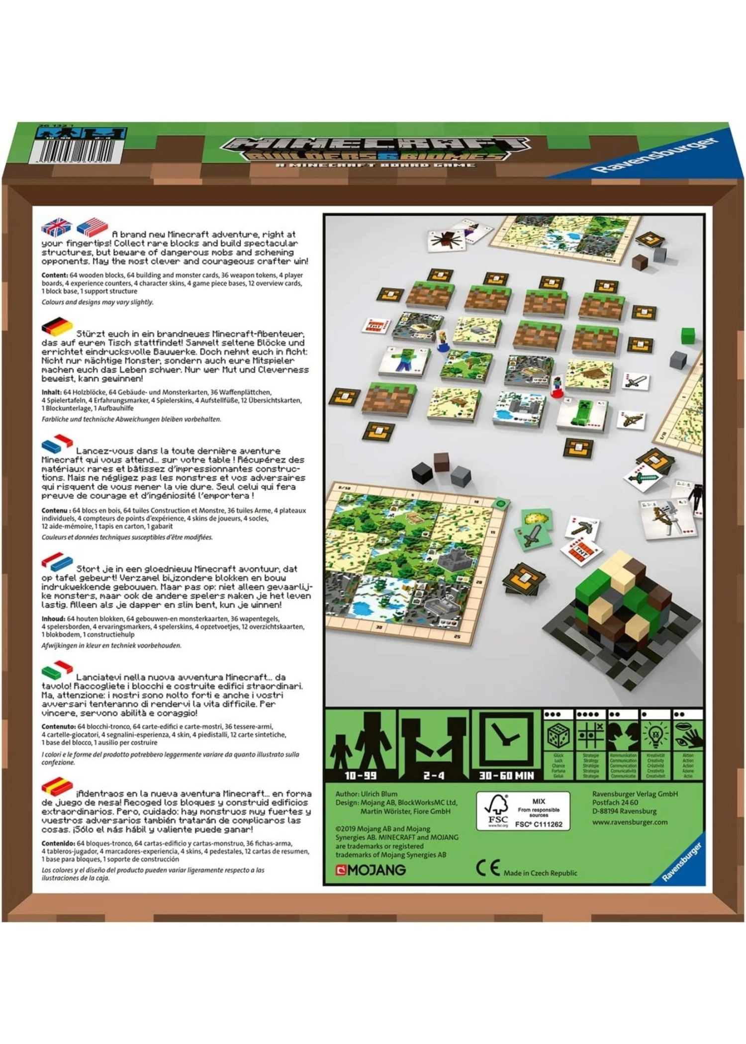 Minecraft: Builders & Biomes comes with high-quality game pieces including 64 resource cubes, 64 building and monster cards, 36 weapon tokens, 4 player boards, 4 experience counters, 4 character skins, 4 game piece bases, 12 overview cards, 1 resource cube base, 1 support structure, and instructions.