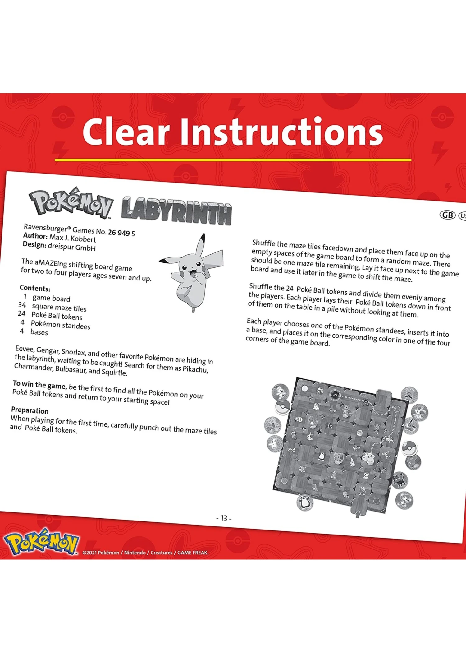Includes: 1 Game Board, 34 Maze Tiles, 24 Poke Ball Tokens, 4 Pokemon Standees, 4 Bases, Instructions