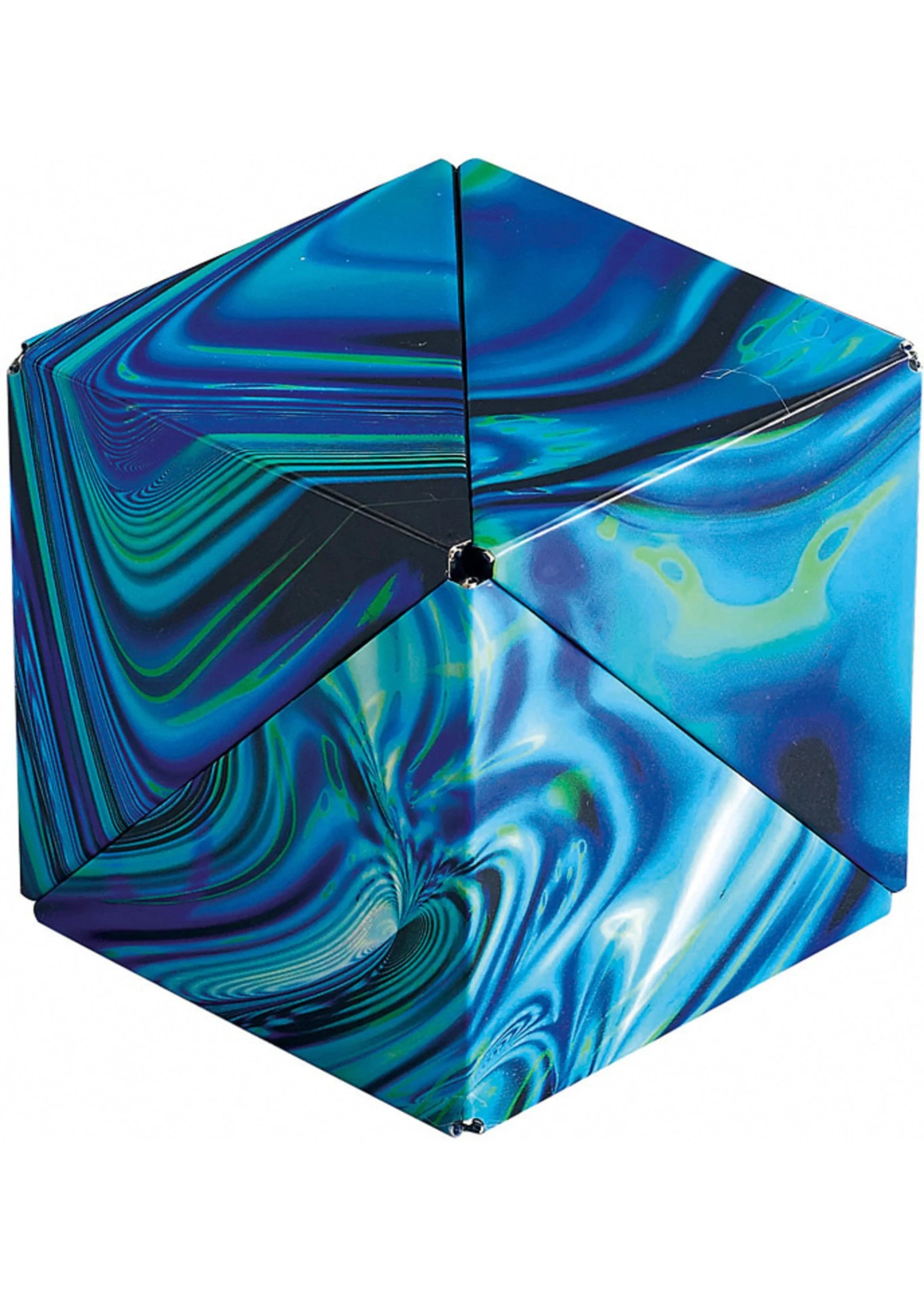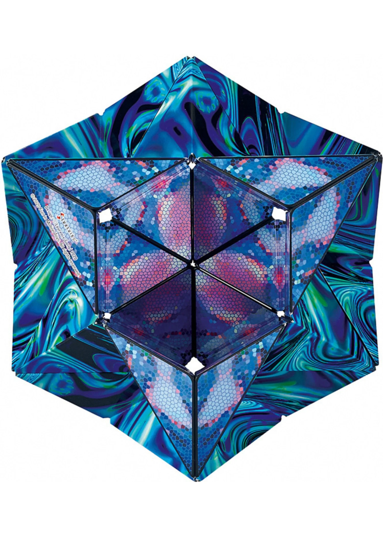 Shashibo is a shape-shifting box that incorporates strong magnets, allowing it to be combined with other Shashibo cubes for making larger sculptures and structures. Folding, captivating, complex, this beautiful magnetic art morphs into 70 different shapes. The Artist Series was designed by American Artist Laurence Gartel, considered a pioneer of digital art. Each Shashibo has 4 art designs – one outer and three inner designs. Mystic Ocean is a 2.4″ cube of blue, black and purple eye-popping color. Download the Shashibo Shape Guide and see if you can master this shape-shifting puzzle.