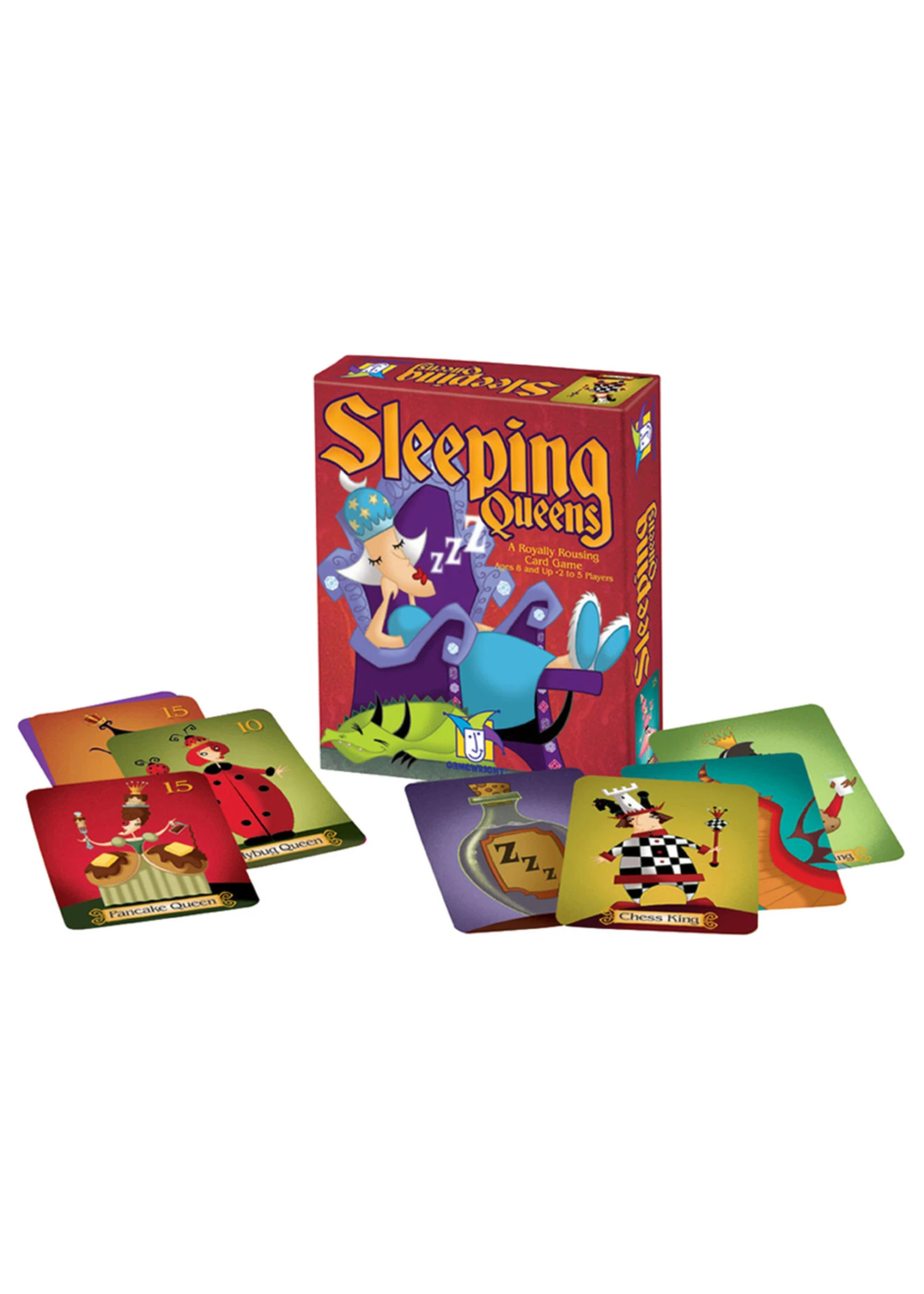 Rise and Shine! The Pancake Queen, the Ladybug Queen and ten of their closest friends have fallen under a sleeping spell and it’s your job to wake them up. Use strategy, quick thinking and a little luck to rouse these napping nobles from their royal slumbers. Play a knight to steal a queen or take a chance on a juggling jester. But watch out for wicked potions and dastardly dragons! The player who wakes the most queens wins.