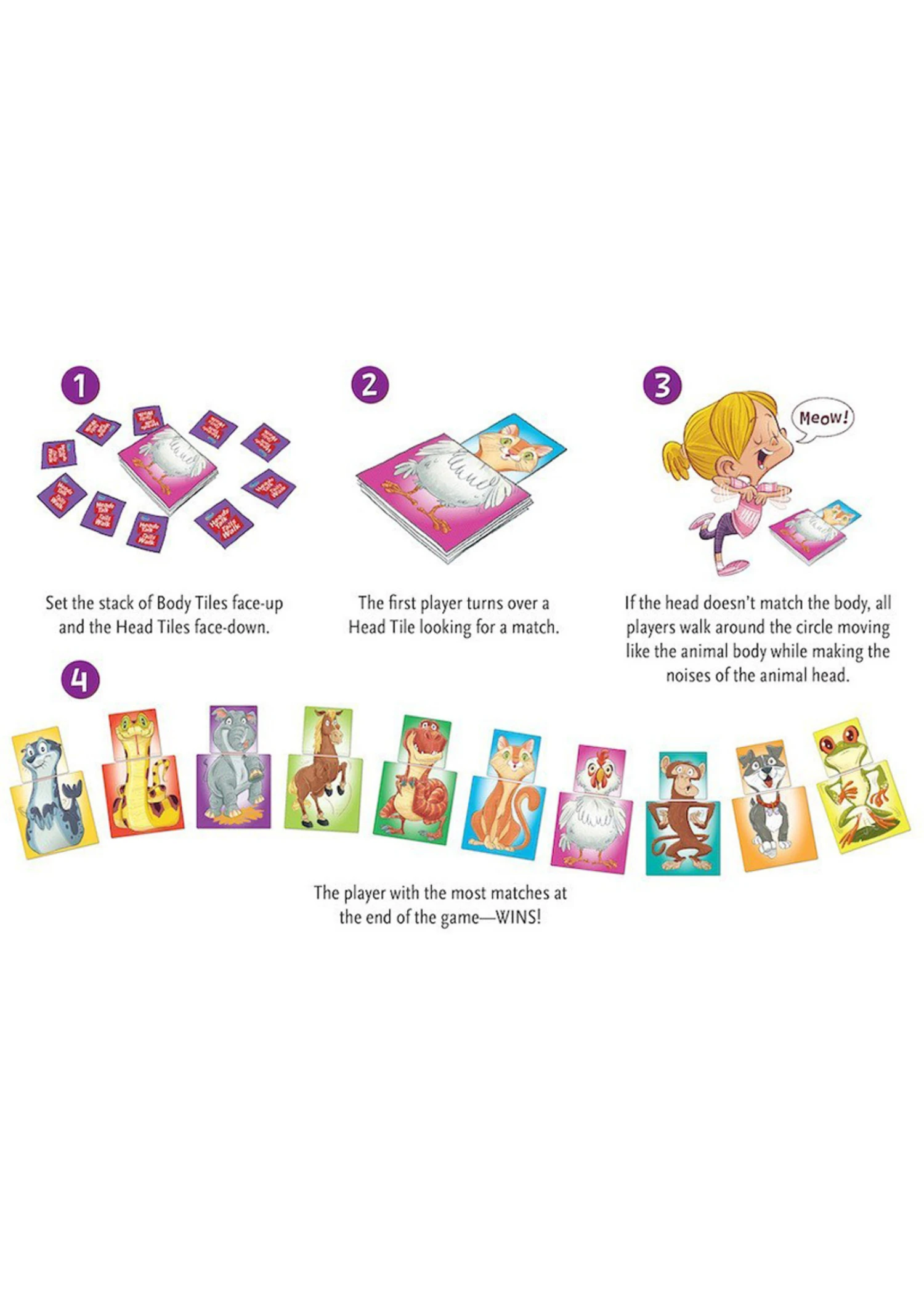 Can you hop like a frog while clucking like a chicken? Have a blast trying with this delightfully silly game for ages 3+. Players try to match hidden head tiles to the correct body tiles. If the head and body don’t match, the real fun begins! Players walk and talk like the mismatched tiles—with hilarious results!