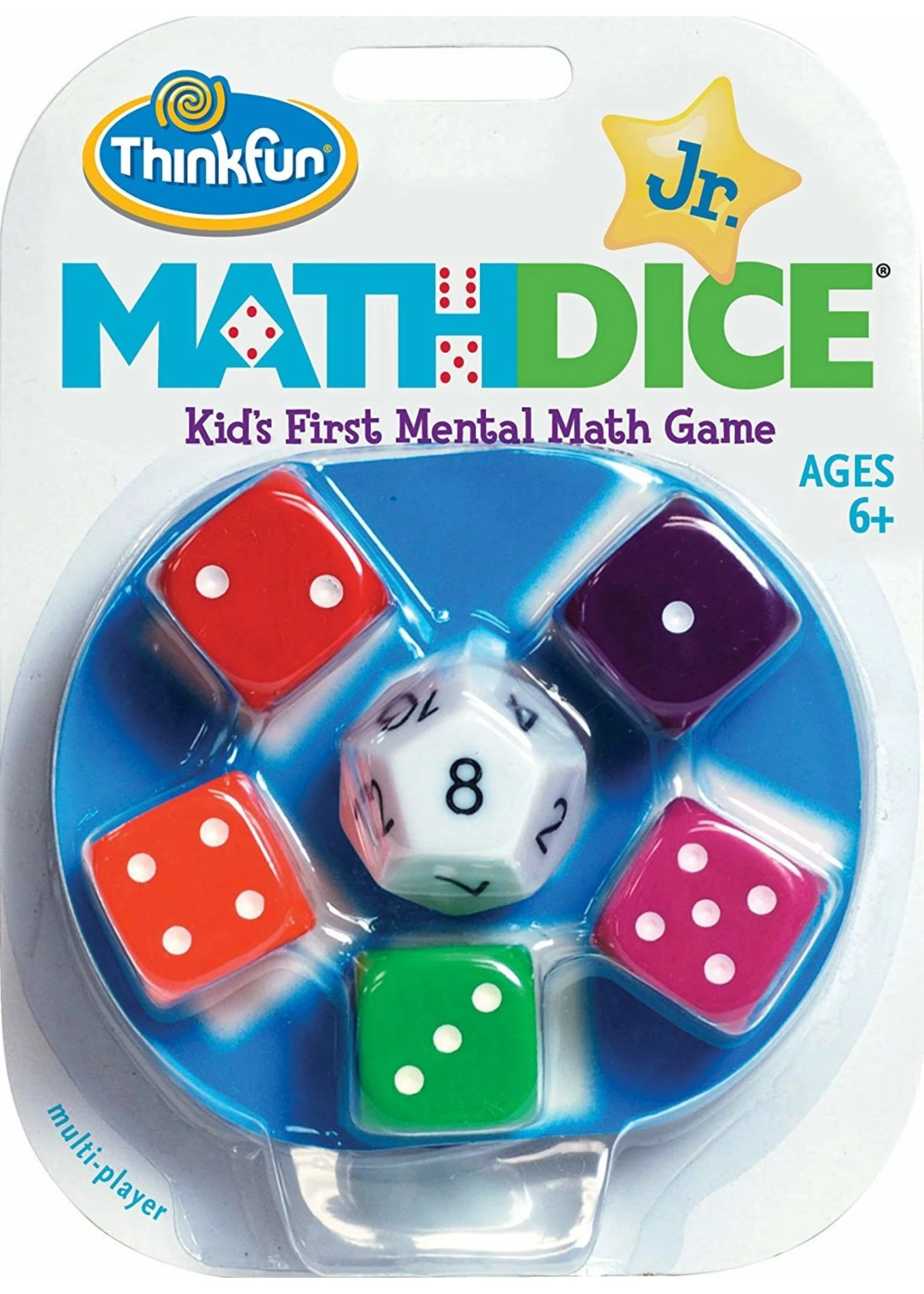 Math Dice Jr. is the perfect dice game to introduce or reinforce early math skills in children. Roll the 12-sided Target Die to get your target number, then roll the five 6-sided Scoring Dice. Add, subtract, or add and subtract – use whatever equation you need to hit your target number. For every Scoring Die used, move one space on the Scoring Track. First to the finish line wins! Math Dice Jr. makes math fun!