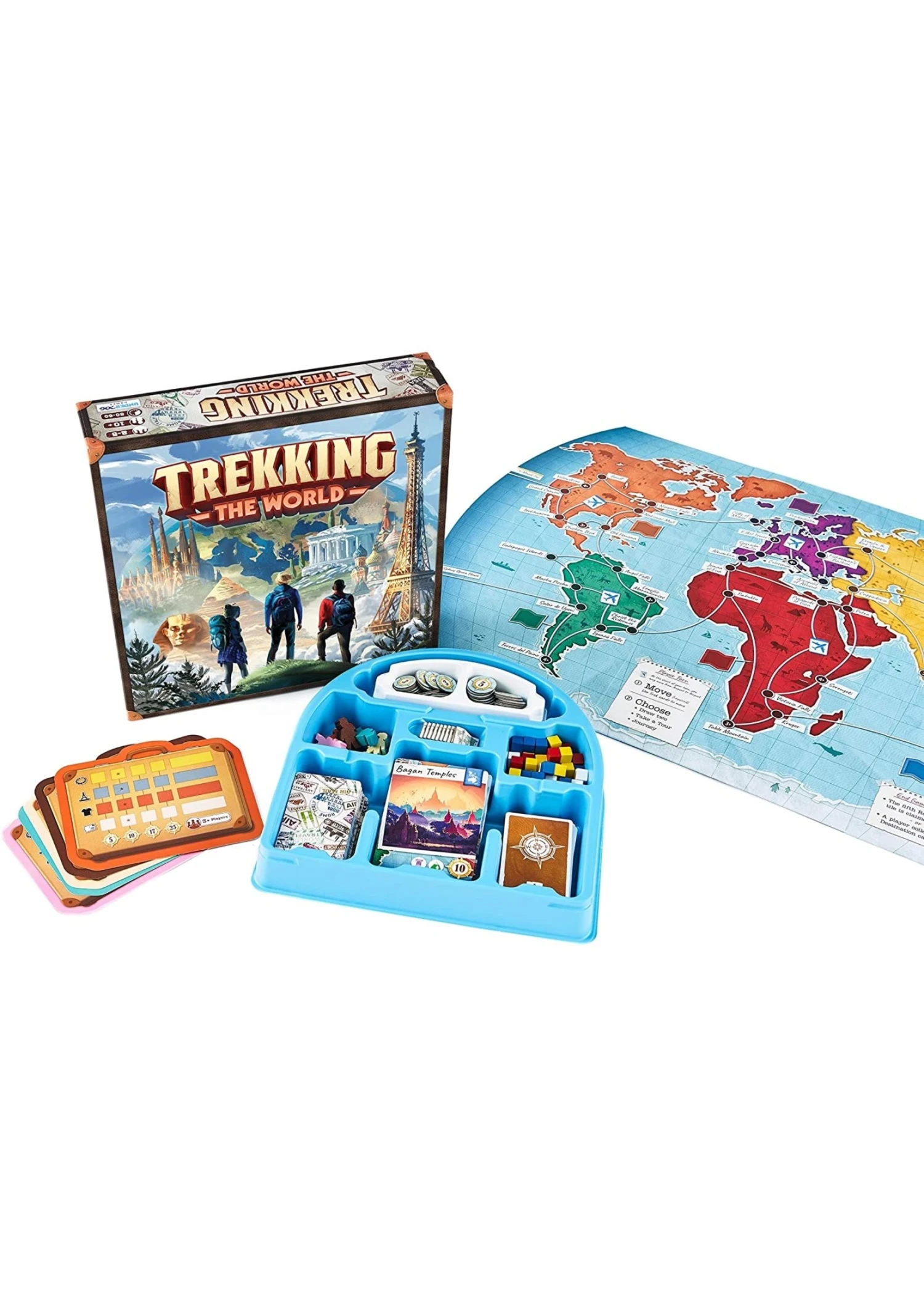 In Trekking the World 2-5 players compete to be the ultimate globe trotter by racing to visit world-renowned locations and collect rare souvenirs along the way. The game spotlights 48 real-world destinations, each beautifully illustrated and accompanied with educational passages to inspire your next getaway.