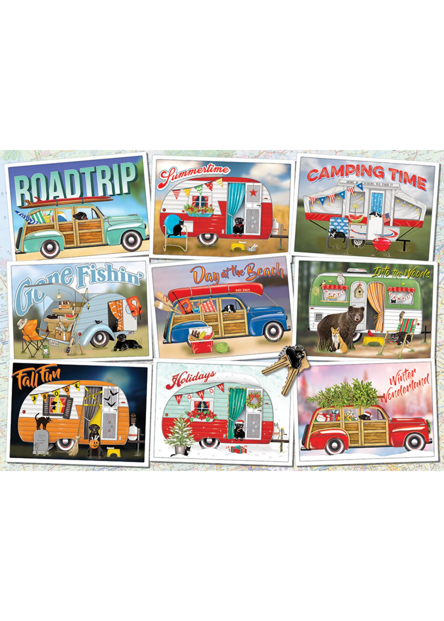 From roadtrips to winter wonderlands, it’s time for Hitting the Road and exploring nine fabulous traveling scenes from the work of Mary Lake-Thompson. Take an adventure with Cobble Hill’s 1000 piece random cut puzzle that includes a reference poster.