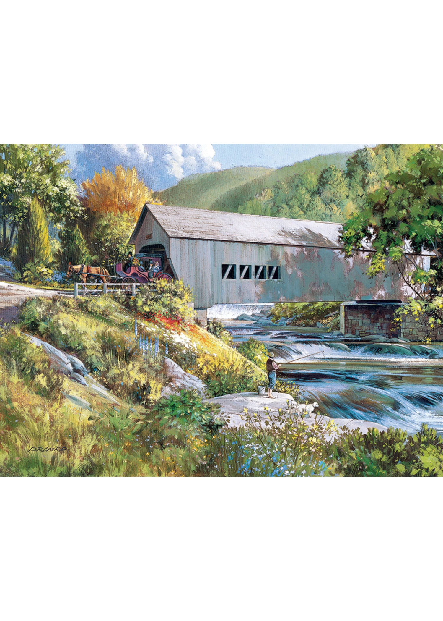 The horse carriage emerging from the Covered Bridge draws the attention of the man fishing off the rocks by the small cascading waterfalls down the rock steps. Cobble Hill’s Easy Handling 275 piece puzzles have extra large random cut pieces to make gripping the pieces easier and the reference poster will help you find your way through the adventure.