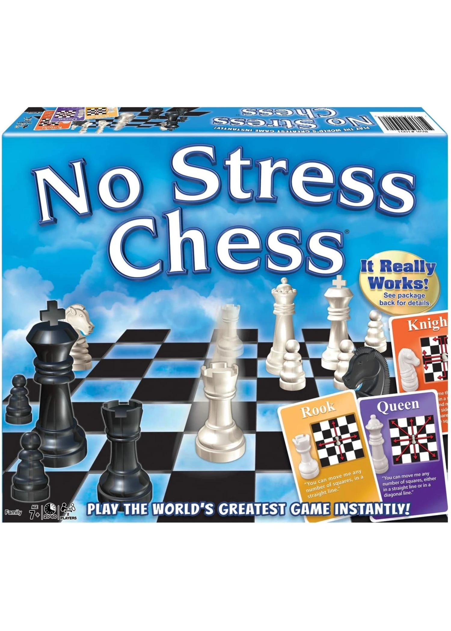 Winning Moves Games is proud to present ‘No Stress Chess’, a game that will help you learn the world’s greatest game – Chess. You can play instantly because the special game board guides you to set up your pieces and each card in the innovative deck shows you how to move the piece it pictures. You just set the pieces on the board, shuffle the deck, and begin to play!